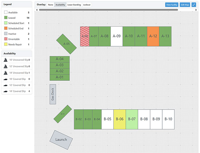 Visualize your marina like never before. Assign slips, docks, and storage units with an interface that updates in real-time. Color-coded availability, occupancy, and payment information help you run your operation smoothly.